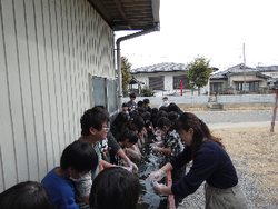 はじめに中島紺屋の中島さんから染め物の説明を受けた後、実際に白い木綿のハンカチをゴムで縛り思い思いの模様を作っていきます。それぞれの形に輪ゴムで絞ったハンカチを藍のツボに付け染めていきました。その後、屋外で風にハンカチをさらすとみるみるうちに綺麗な藍色変わっていきました。模様はみんな一人ひとり素敵なものに仕上がっていました。